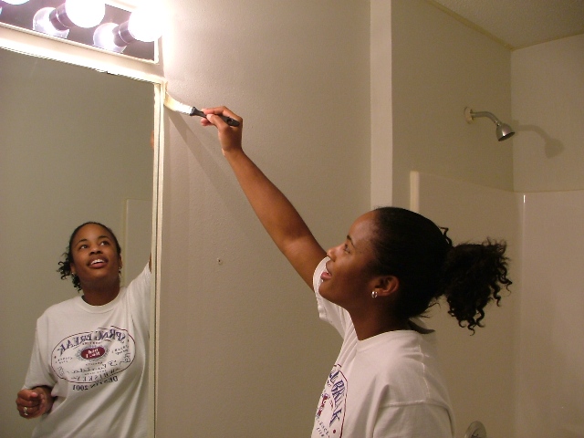 Our only non-painting adventure, Seaside, FloridaRoz getting going around the mirrorOnto every foot, a little paint must fall...Roz marking off the showerThe bath beforeThe bath after, version 1. A little too desert-ishThe bath after, version 2The bedroom before, with simple white wallsThe bedroom after we worked some magic